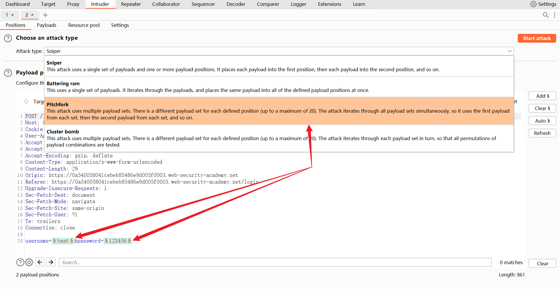 - 攻击类型选择第三个 “Pitchfork” 。