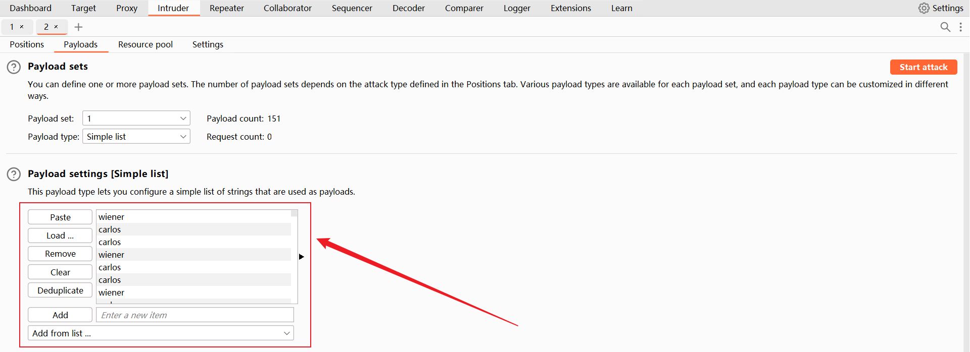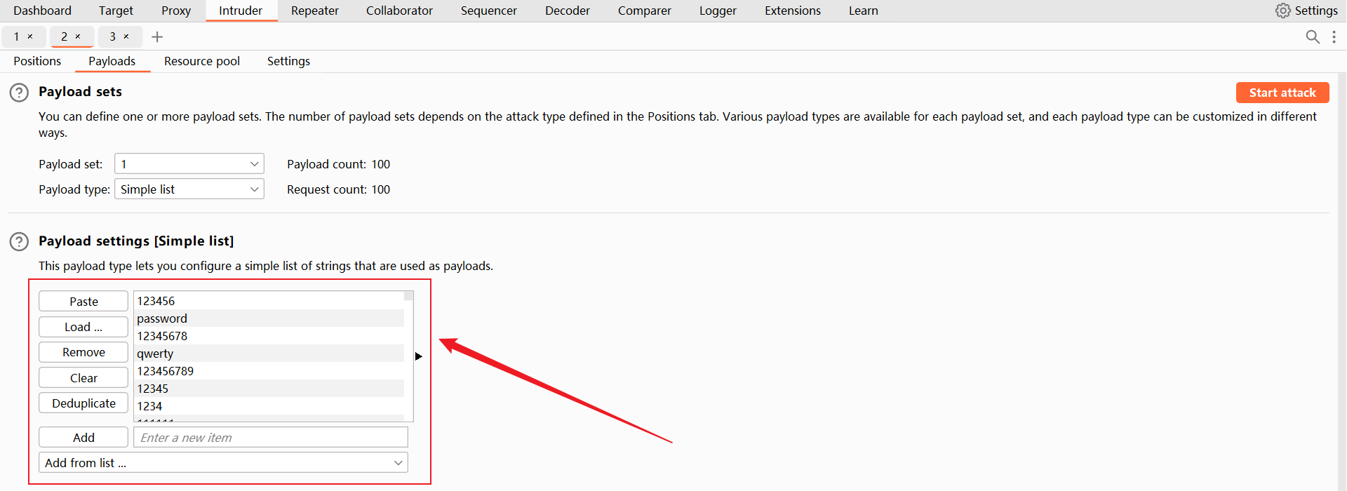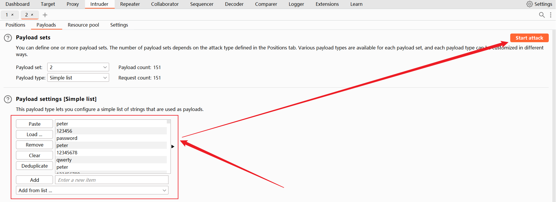设置载荷2,导入上一步生成的 密码列表。