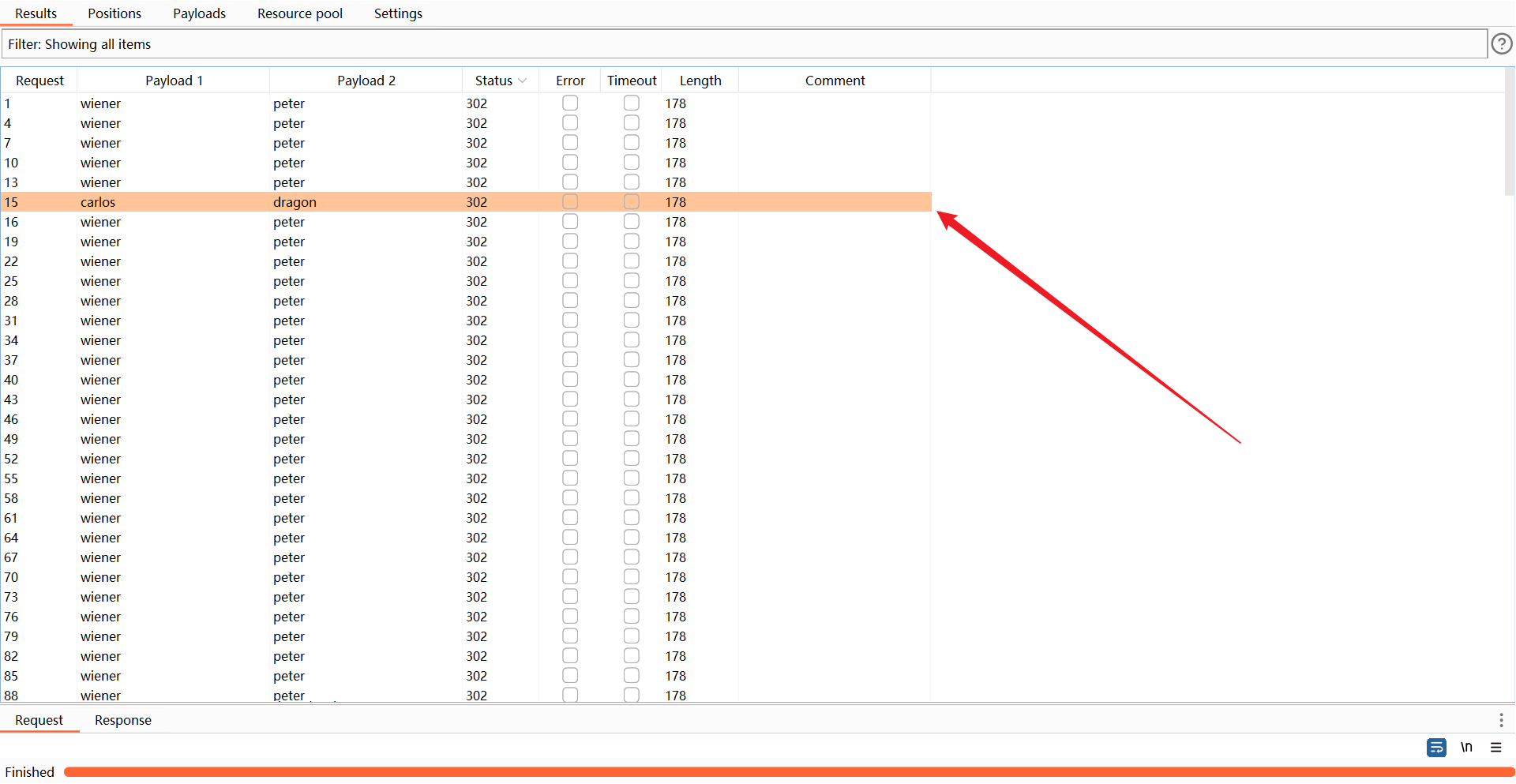 先启动 窗口1 的攻击(fast 速率的那个),该窗口会不断发送wiener:peter的登录请求(一直登录成功)。