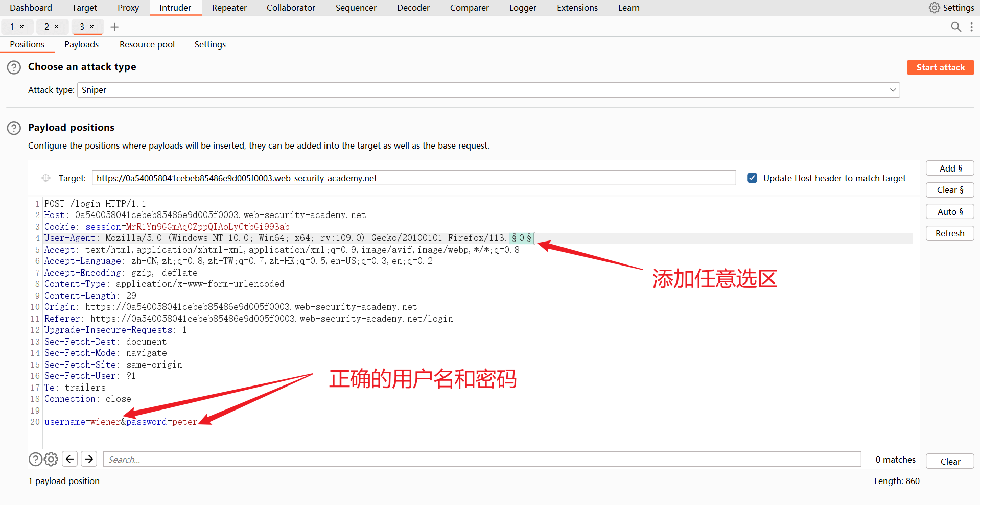 wiener:peter。 - 实验室提供了一个正确的用户名