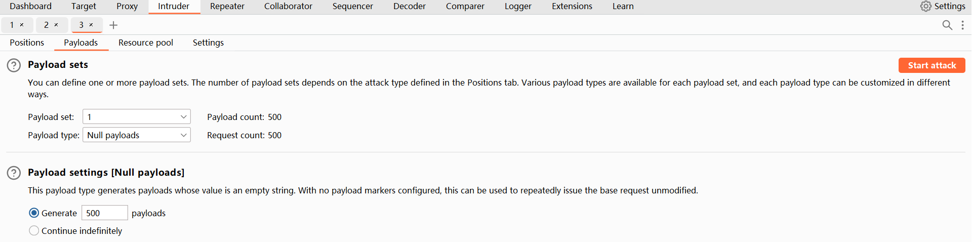 - 攻击类型为:Null payloads(空载荷)