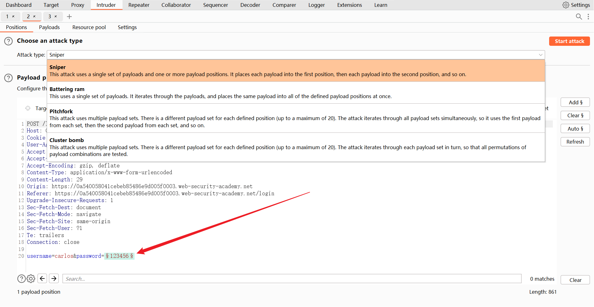 Intruder 先对carlos用户的密码暴破 2 次(失败 2 次)。