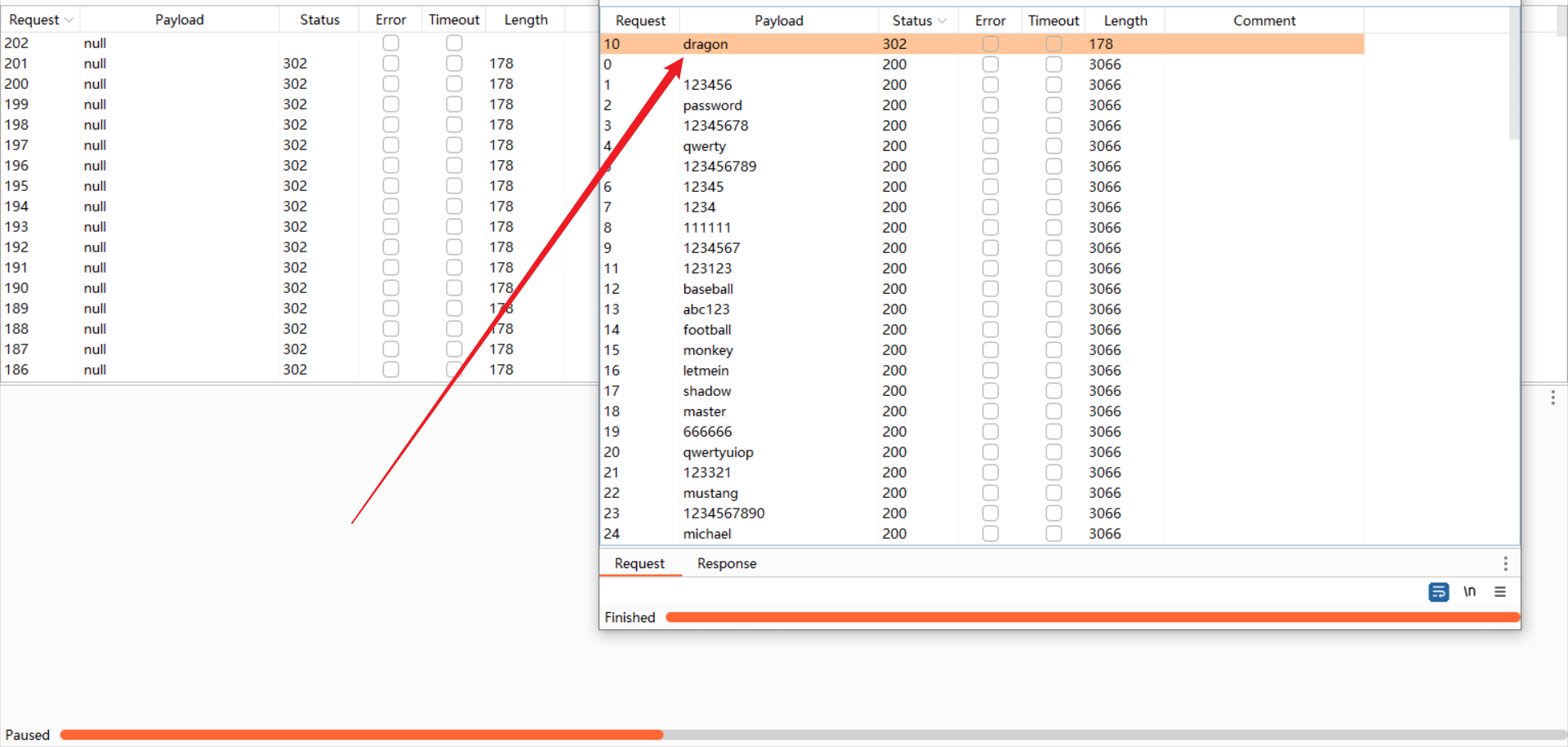 攻击结束之后,对结果进行排序,获得正确的用户名和密码: