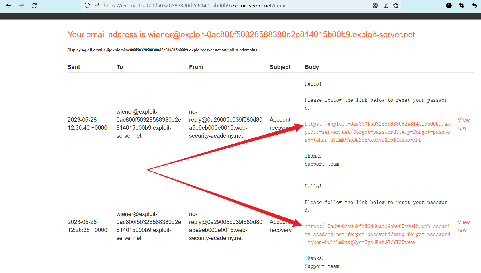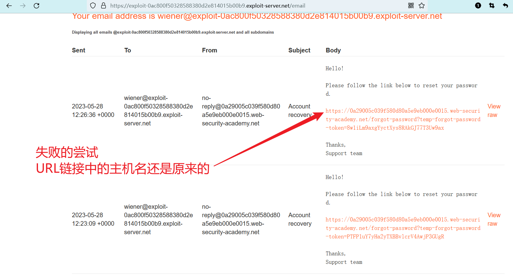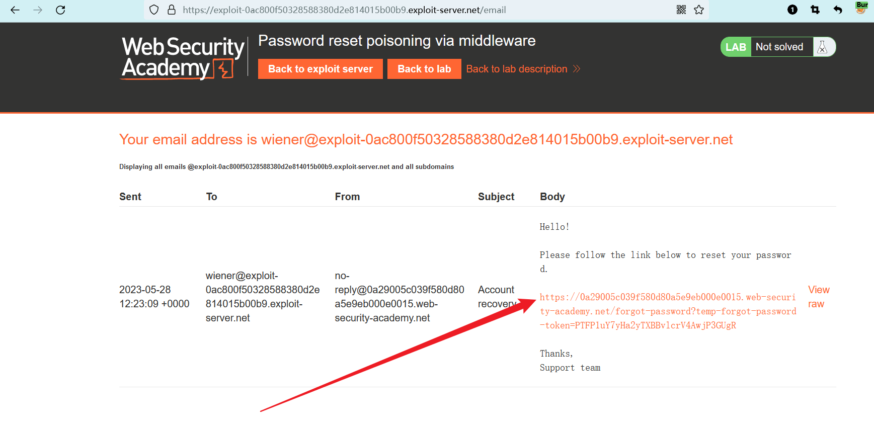 在wiener用户的邮箱中,可以看到一封电子邮件,其中包含密码重置链接。