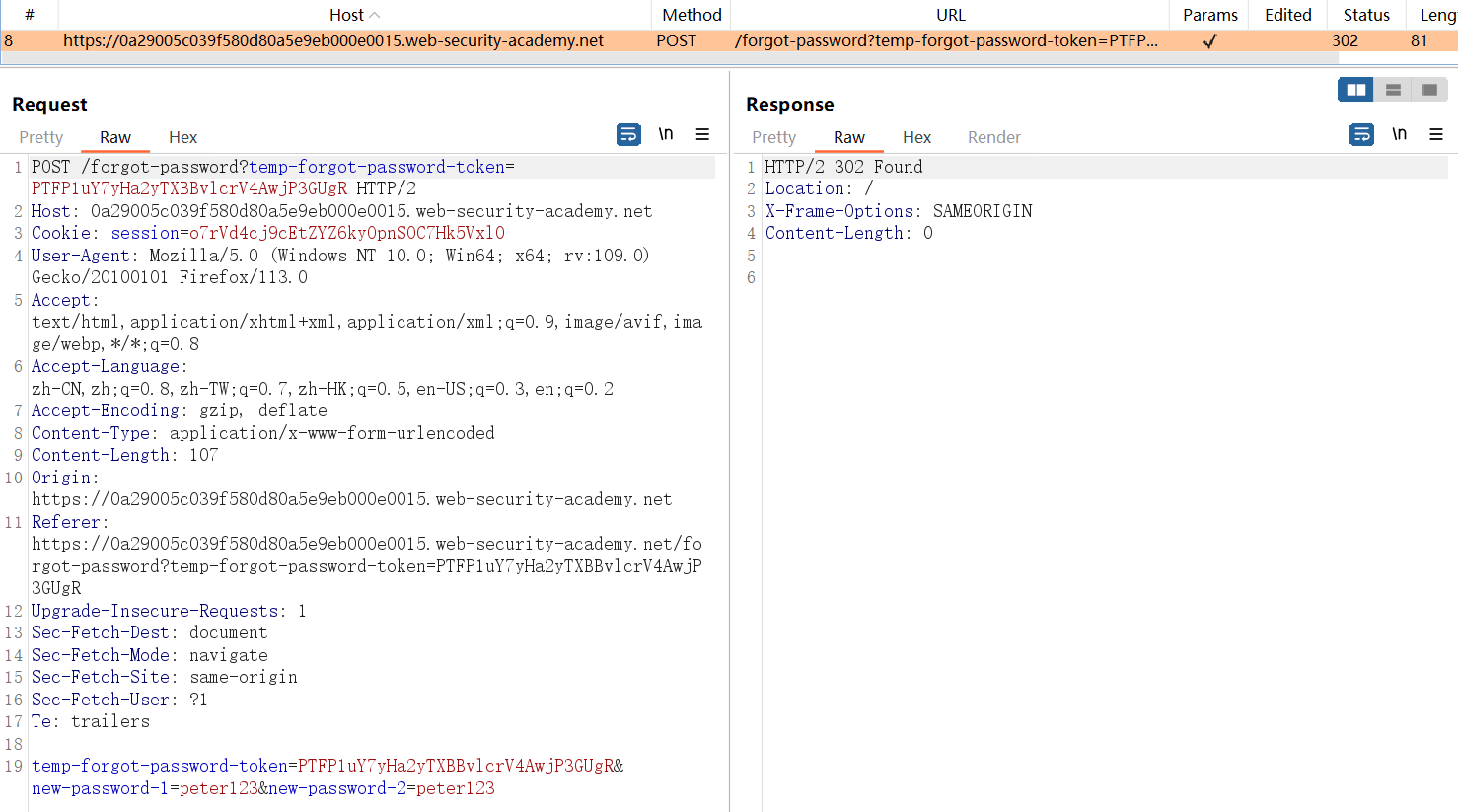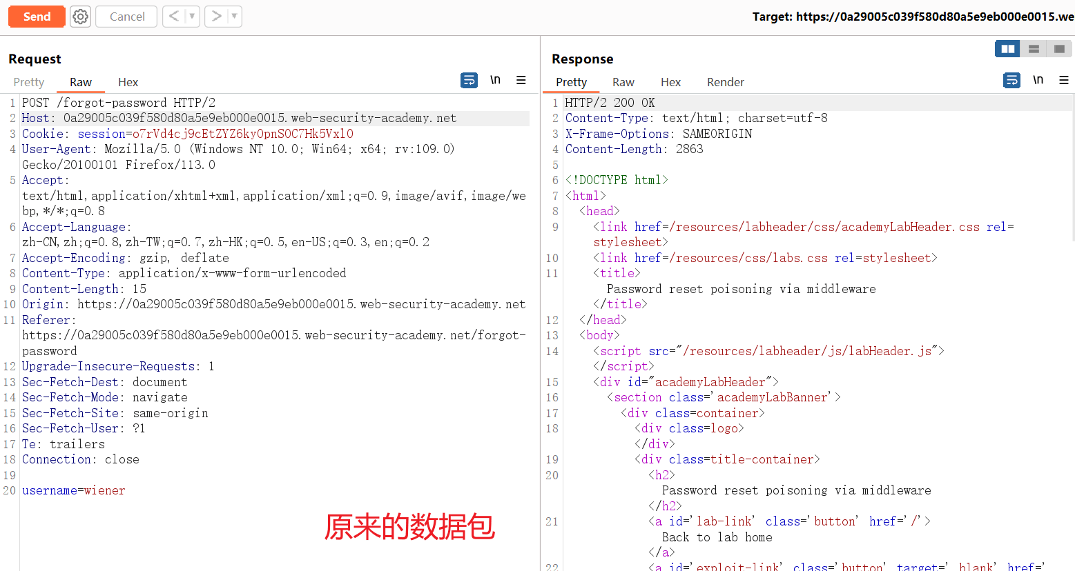 第 1 个数据包,在忘记密码页面 输入用户名,然后提交表单,应用程序会向 wiener 用户的邮箱中发送密码重置链接。