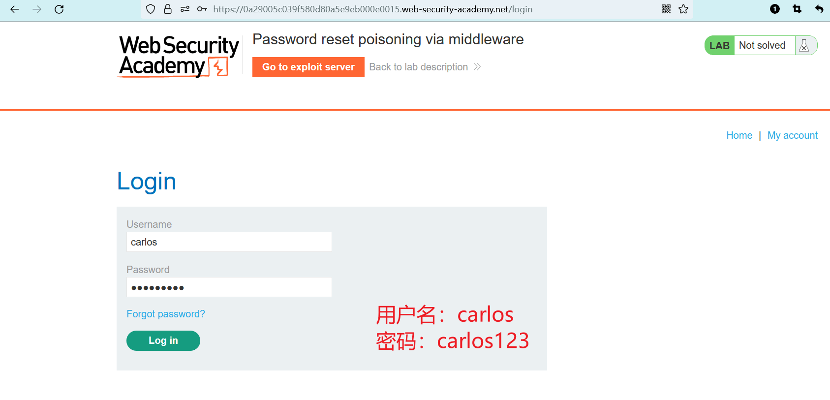 修改成功之后,回到登录页面,使用用户名和密码进行登录carlos:carlos123。