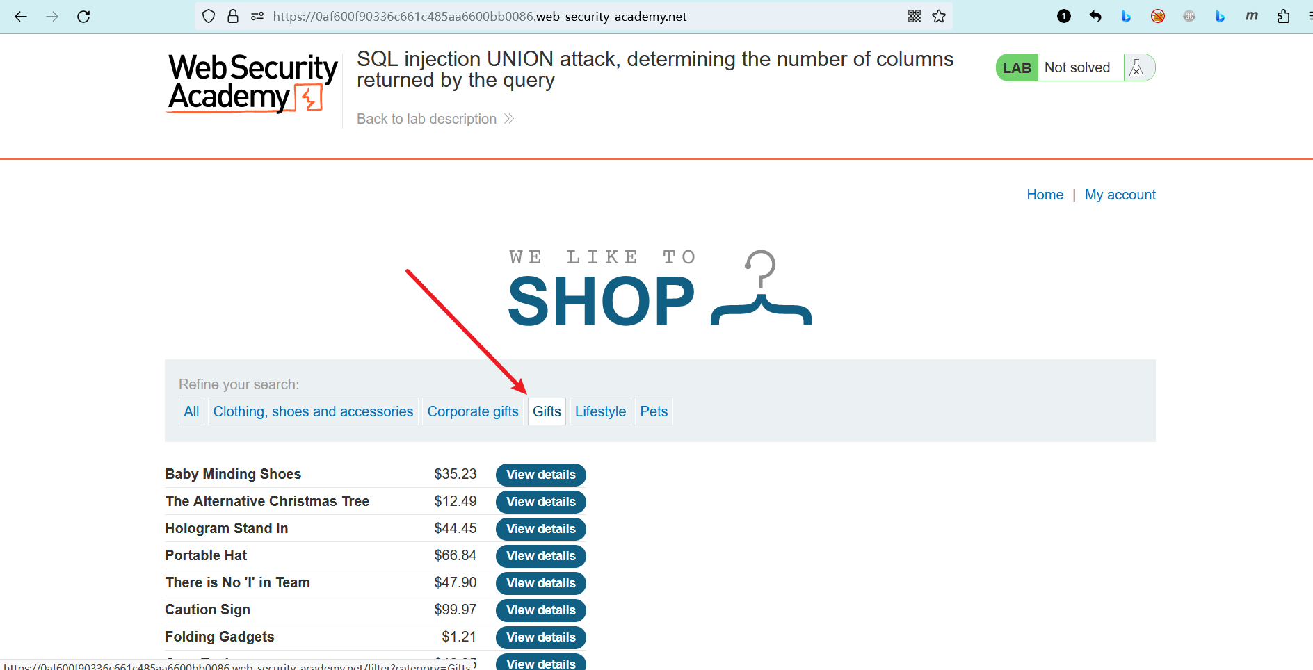 要通过该实验室,必须对category参数进行SQL注入,并确定应用程序查询返回的列数