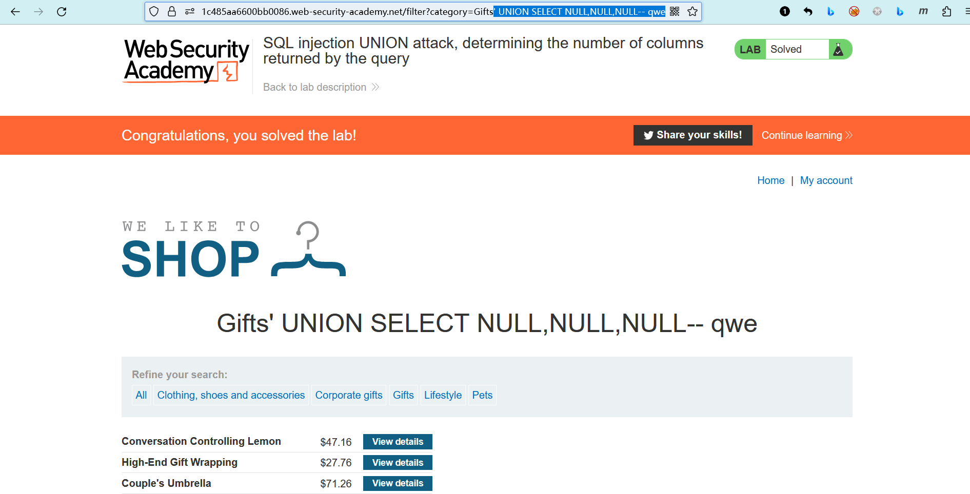 题目让我们使用第二种方式确认列数,在Gifts后方添加 ' UNION SELECT NULL-- qwe