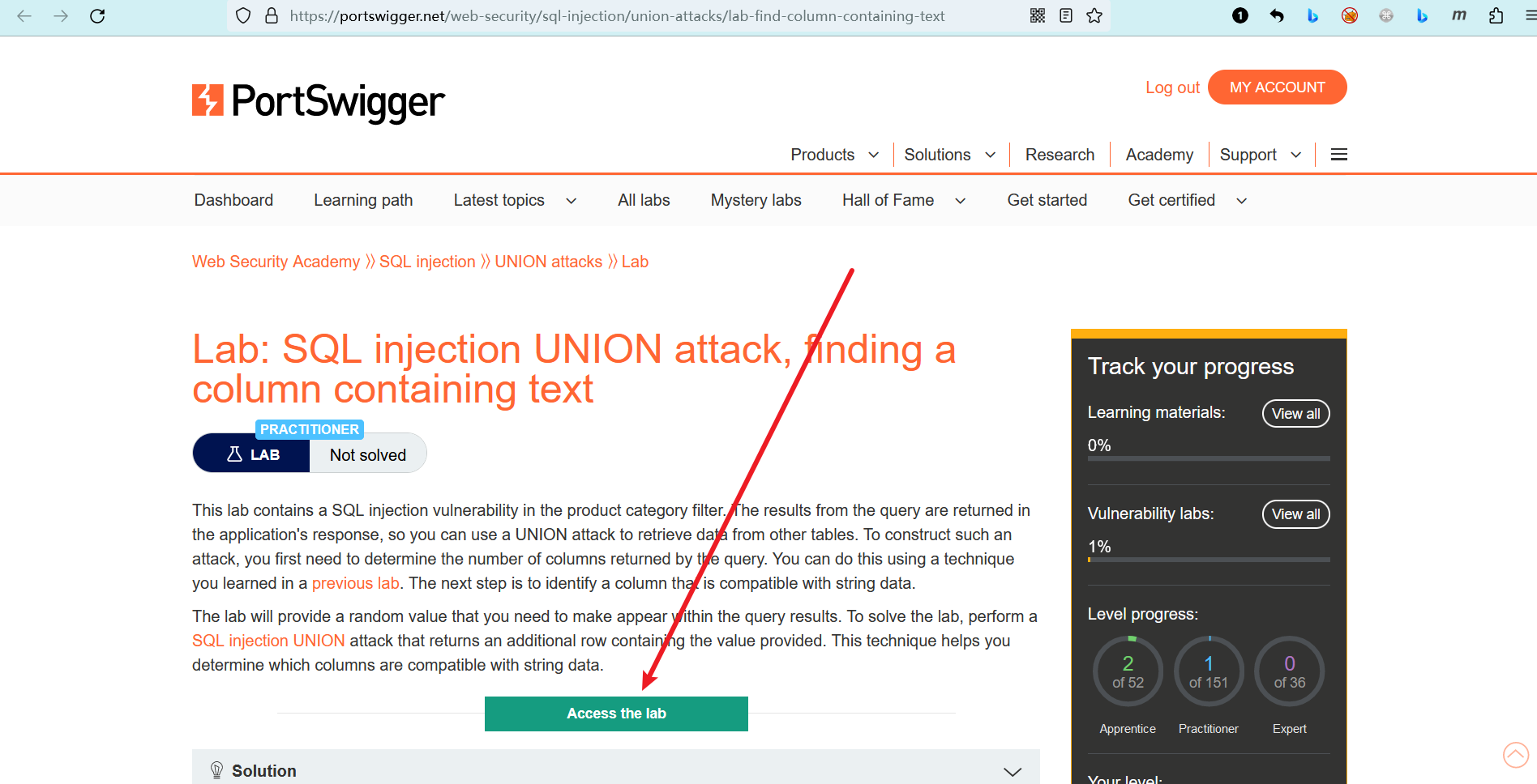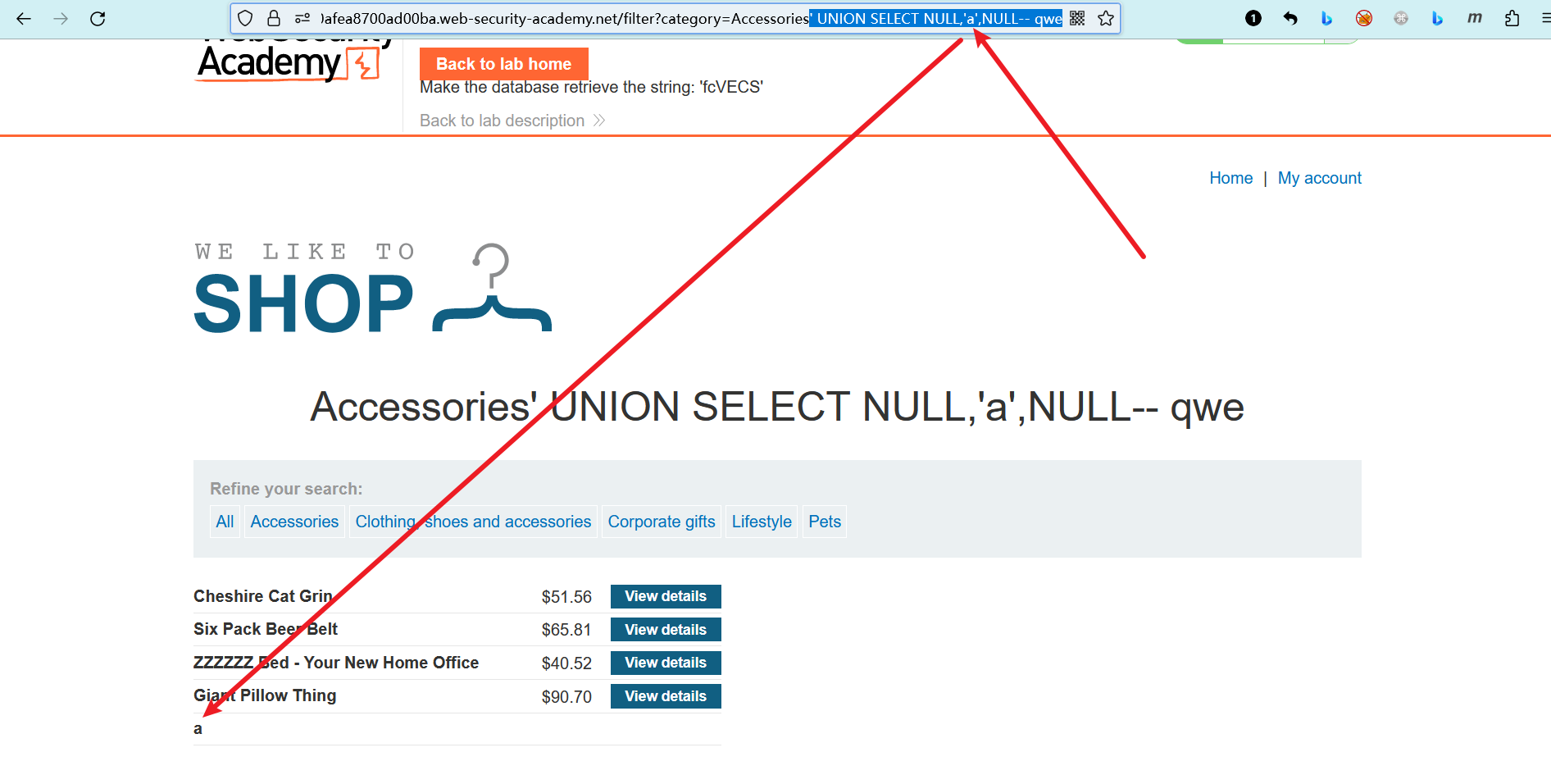实验室将提供一个随机值,你需要使该值显示在查询结果中。若要解决实验室问题,请执行 SQL 注入 UNION 攻击,该攻击返回包含所提供值的附加行。此方法可帮助您确定哪些列与字符串数据兼容。