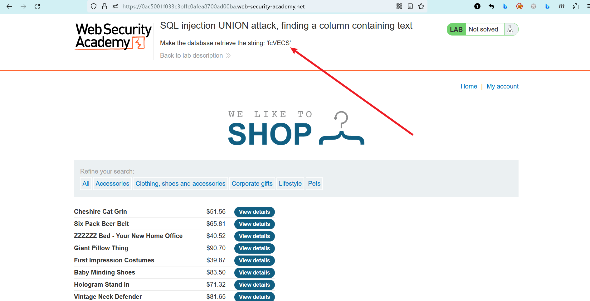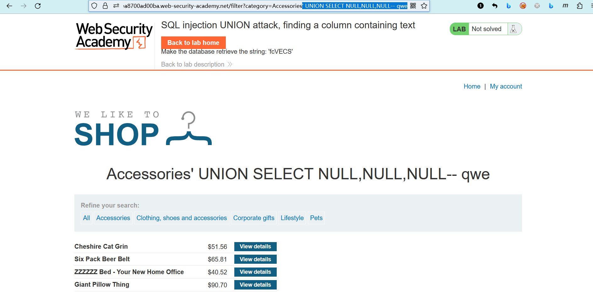 # 实验室: SQL注入UNION攻击,查找包含文本的列