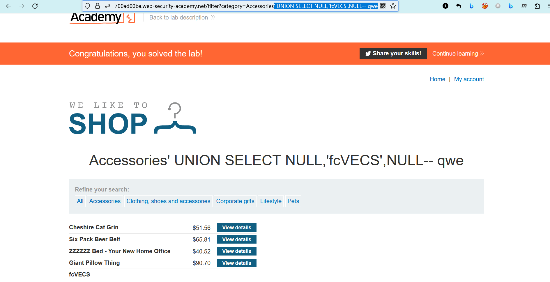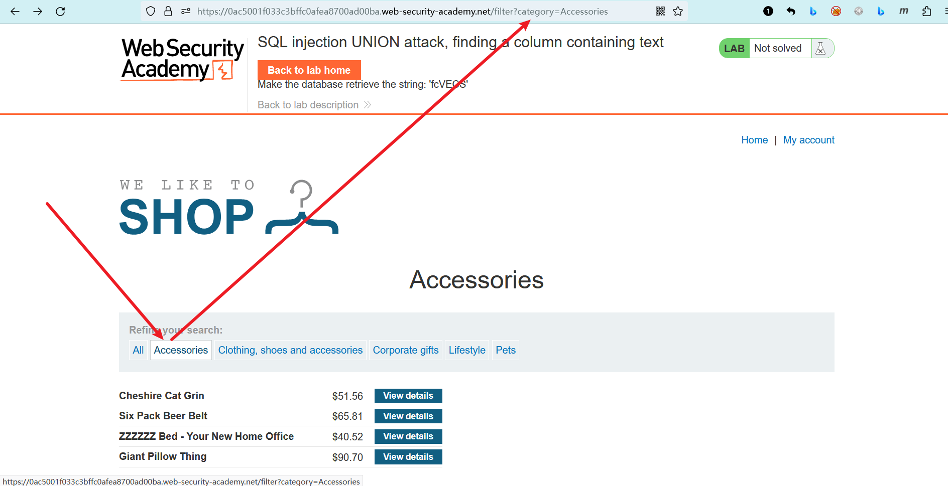 此实验室在产品类别筛选器中包含SQL注入漏洞 (opens new window)。
