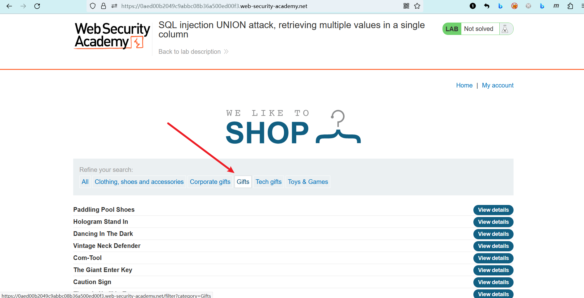 此实验室在产品类别筛选器中包含SQL注入漏洞 (opens new window)。