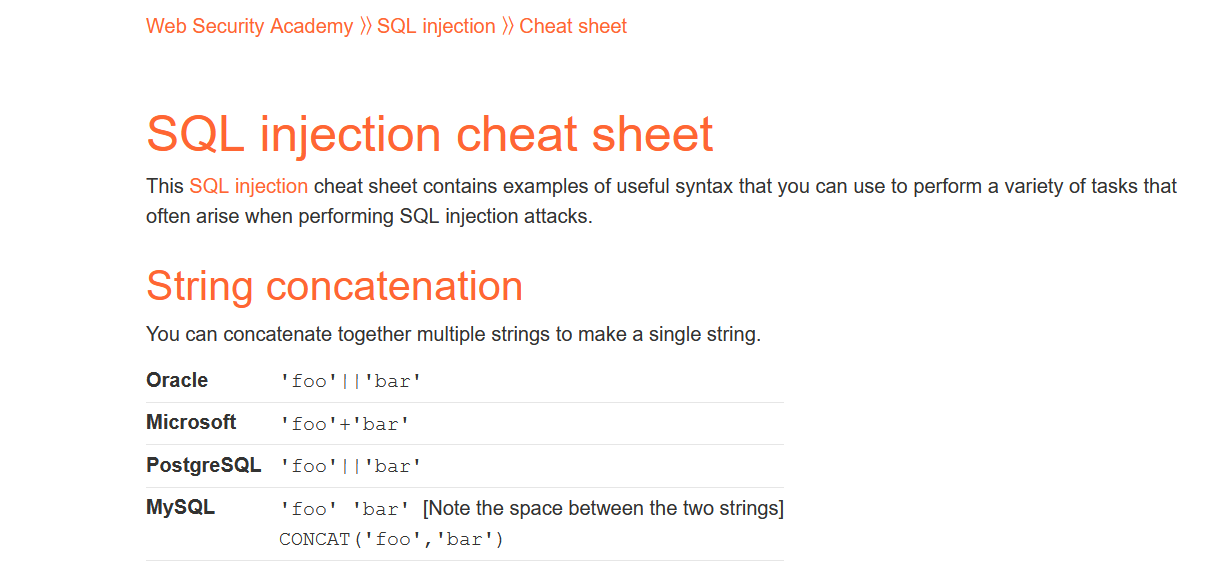 您可以在SQL注入备忘单 (opens new window)上找到一些有用的有效负载。