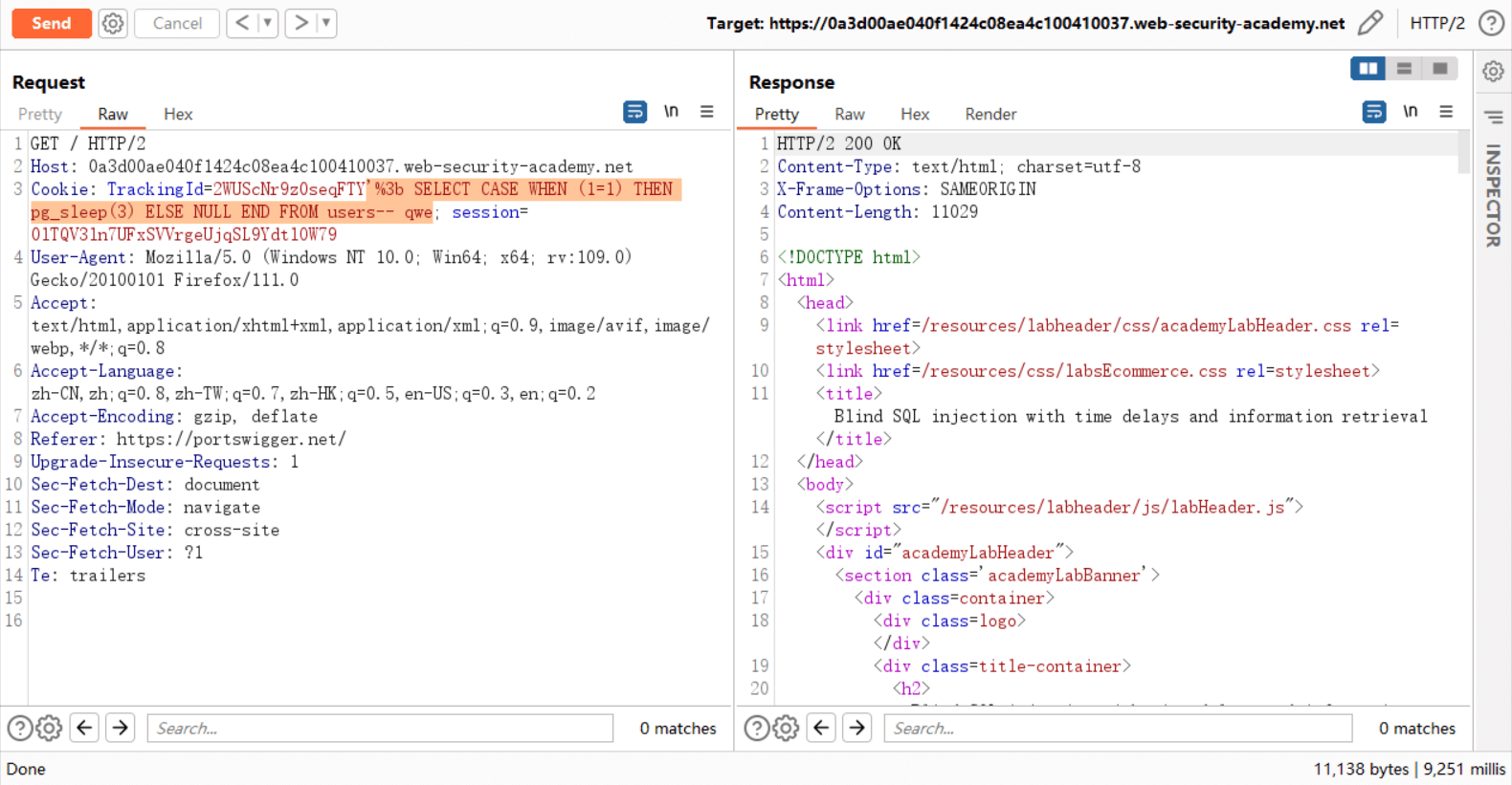 desc: 带有时间延迟和信息检索的SQL盲注入 >>