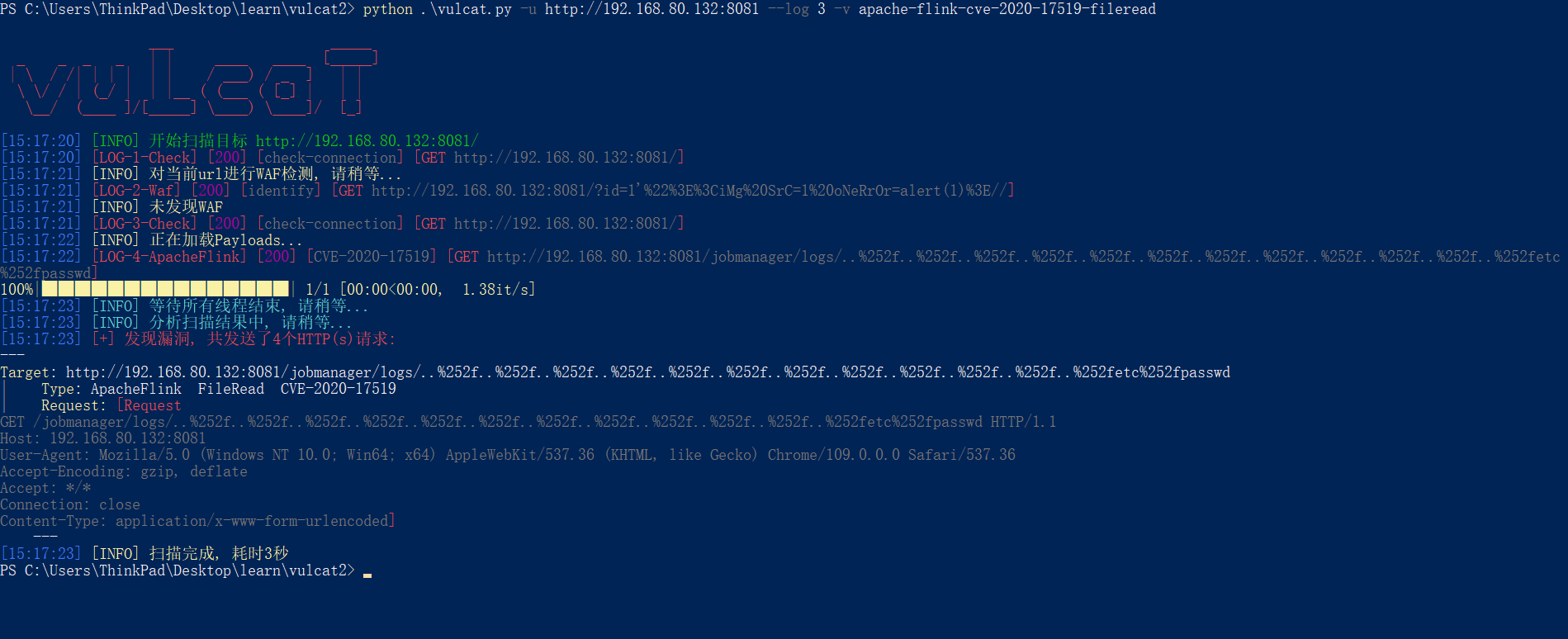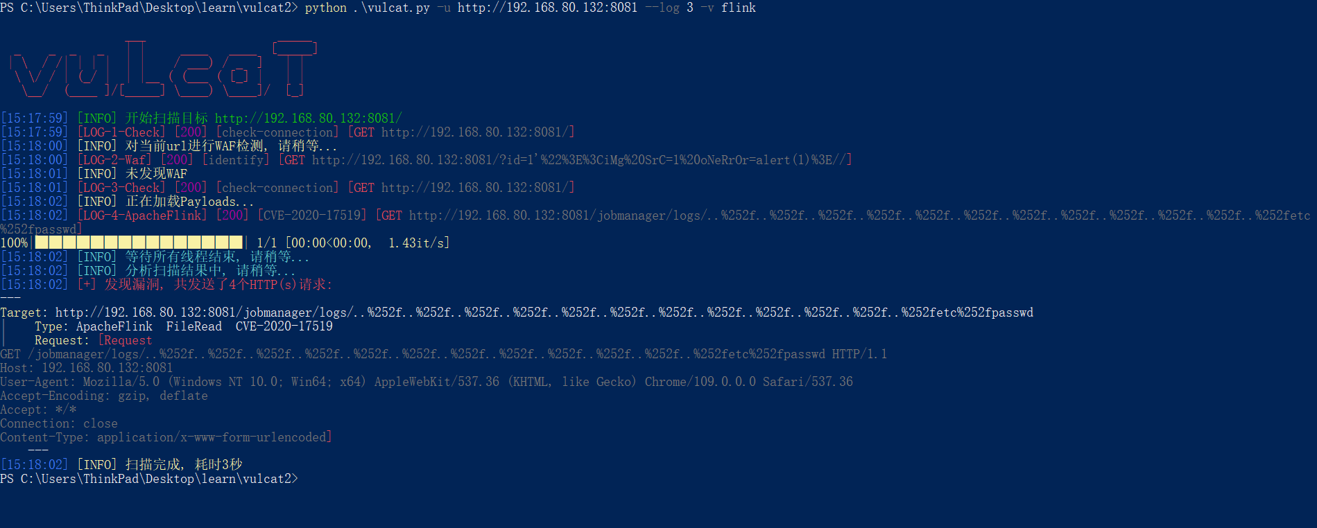 python vulcat.py -u <目标地址> --log 3 -v <载荷名称>